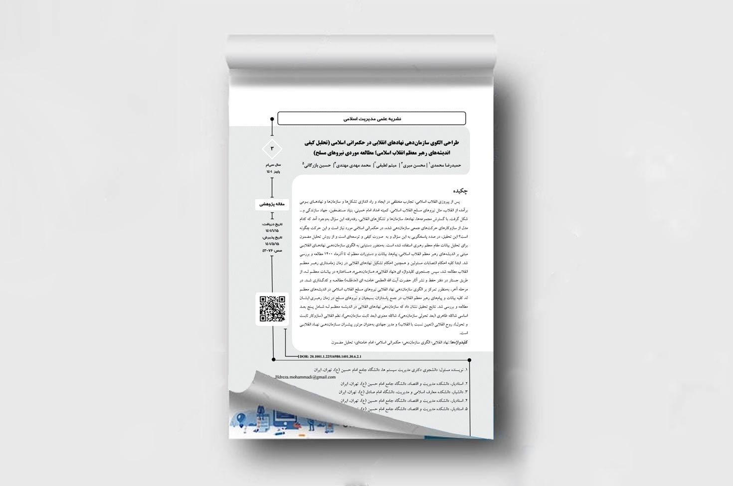 پس از پیروزی انقلاب اسلامی، تجارب مختلفی در ایجاد و راه‌اندازی تشکل‌ها و سازمان‌ها و نهادهای بومی برآمده از انقلاب، مثل نیروهای مسلح انقلاب اسلامی، کمیته امداد امام خمینی، بنیاد مستضعفین، جهاد سازندگی و… شکل گرفت. با گسترش مجموعه‌ها، نهادها، سازمان‌ها و تشکل‌های انقلابی، رفته‌رفته این سوال به‌وجود آمد که کدام مدل از سازوکارهای حرکت‌های جمعی سازمان‌دهی شده، در حکمرانی اسلامی مورد نیاز است و این حرکت چگونه است؟ این تحقیق، در صدد پاسخگویی به این سوال و به‌صورت کیفی و توسعه‌ای است و از روش تحلیل مضمون برای تحلیل بیانات مقام معظم رهبری استفاده شده است. به‌منظور دستیابی به الگوی سازمان‌دهی نهادهای انقلابی مبتنی بر اندیشه‌های رهبر معظم انقلاب اسلامی، پیام‌ها، بیانات و دستورات معظم له تا آذرماه ۱۴۰۰ مطالعه و بررسی شد. ابتدا کلیه احکام انتصابات مسئولین و همچنین احکام تشکیل نهادهای انقلابی در زمان زمامداری رهبر معظم انقلاب مطالعه شد، سپس جستجوی کلیدواژهای «نهاد انقلابی»، «سازمان‌دهی»، «ساختار» در بیانات معظم له، از طریق جستار در دفتر حفظ و نشر آثار حضرت آیت الله العظمی خامنهای (مدظله) مطالعه و کدگذاری شد. در مرحله آخر، به‌منظور تمرکز بر الگوی سازمان‌دهی نهاد انقلابی نیروهای مسلح انقلاب اسلامی در اندیشه‌های معظم له، کلیه بیانات و پیام‌های رهبر معظم انقلاب در جمع پاسداران، بسیجیان و نیروهای مسلح در زمان رهبری ایشان مطالعه و بررسی شد. نتایج تحقیق نشان داد که سازمان‌دهی نهادهای انقلابی در اندیشه معظم له شامل پنج بعد اساسی شاکله ظاهری (بعد تحولی سازمان‌دهی)، شاکله معنوی (بعد ثابت سازمان‌دهی)، نظم انقلابی (سازوکار ثابت و تحول)، روح انقلابی (تعیین نسبت با انقلاب) و مدیر جهادی به‌عنوان موتور پیشران سازمان‌دهی نهاد انقلابی است.