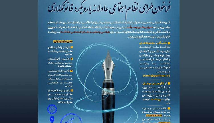 نخبگان و مجموعههای علاقمند، ایدهها ، چارچوب نظری و گامهای پیشنهادی را برای طرّاحی و تنظیم نظام اجتماعی عادلانه با رویکرد قانونگذاری به نشانی (cmir@parliran.ir) ارسال نمایند.