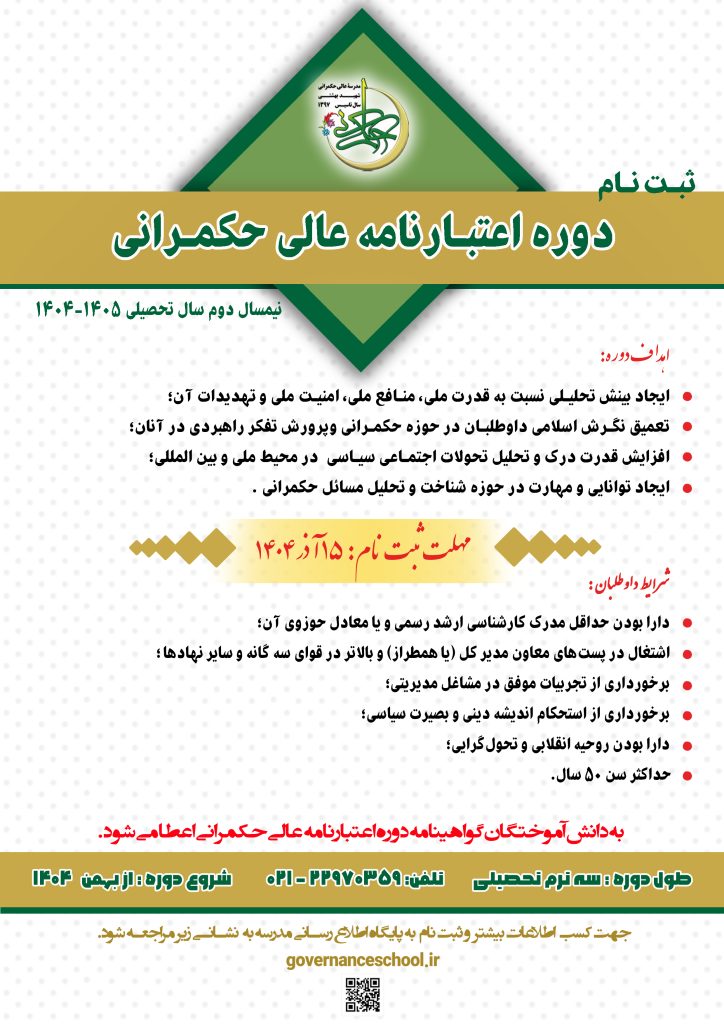 مدرسه عالی حکمرانی شهید بهشتی به عنوان متولی آموزشهای بنیادین و کاربردی در حوزه حکمرانی در کشور برای نیمسال دوم سال تحصیلی ۱۴۰۵-۱۴۰۴، دوره اعتبارنامه عالی حکمرانی با شرایط زیر برگزار میکند.