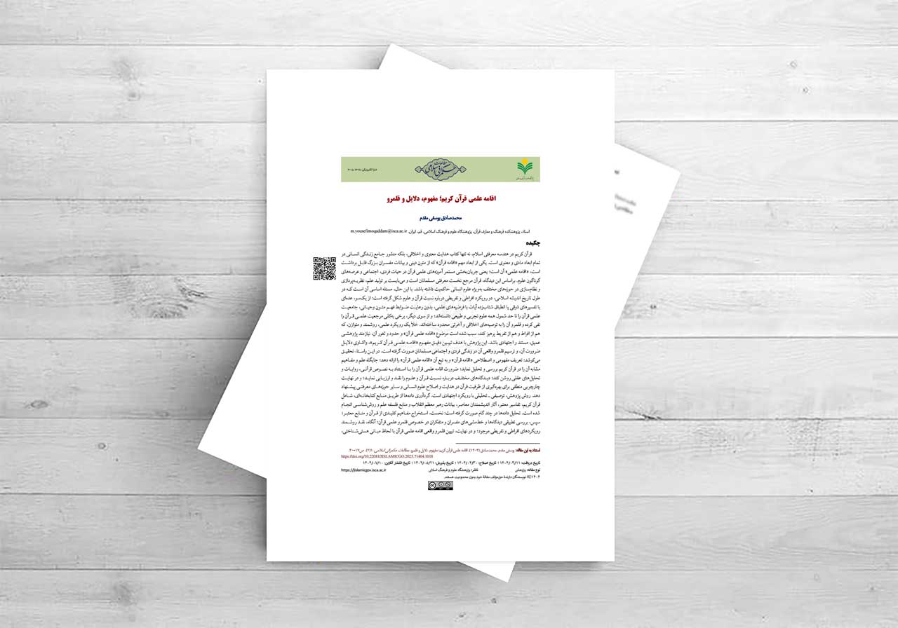 قرآن کریم در هندسه معرفتی اسلام، نه تنها کتاب هدایت معنوی و اخلاقی، بلکه منشور جامع زندگی انسانی در تمام ابعاد مادی و معنوی است. یکی از ابعاد مهم «اقامه قرآن» که از متون دینی و بیانات مفسران بزرگ قابل برداشت است، «اقامه علمی» آن است؛ یعنی جریانبخشی مستمر آموزههای علمی قرآن در حیات فردی، اجتماعی و عرصههای گوناگون علوم. براساس این دیدگاه، قرآن مرجع نخست معرفتی مسلمانان است و میبایست بر تولید علم، نظریهپردازی و نظامسازی در حوزههای مختلف بهویژه علوم انسانی حاکمیت داشته باشد. با این حال، مسئله اساسی آن است که در طول تاریخ اندیشه اسلامی، دو رویکرد افراطی و تفریطی درباره نسبت قرآن و علوم شکل گرفته است: از یکسو، عدهای با تفسیرهای ذوقی یا انطباق شتابزده آیات با فرضیههای علمی، بدون رعایت ضوابط فهم متون وحیانی، جامعیت علمی قرآن را تا حد شمول همه علوم تجربی و طبیعی دانستهاند؛ و از سوی دیگر، برخی بهکلی مرجعیت علمی قرآن را نفی کرده و قلمرو آن را به توصیههای اخلاقی و آخرتی محدود ساختهاند. خلأ یک رویکرد علمی، روشمند و متوازن، که هم از افراط و هم از تفریط پرهیز کند، سبب شده است موضوع «اقامه علمی قرآن» و حدود و ثغور آن، نیازمند پژوهشی عمیق، مستند و اجتهادی باشد. این پژوهش با هدف تبیین دقیق مفهوم «اقامه علمی قرآن کریم»، واکاوی دلایل ضرورت آن، و ترسیم قلمرو واقعی آن در زندگی فردی و اجتماعی مسلمانان صورت گرفته است. در این راستا، تحقیق میکوشد: تعریف مفهومی و اصطلاحی «اقامه قرآن» و به تبع آن «اقامه علمی قرآن» را ارائه دهد؛ جایگاه علم و مفاهیم مشابه آن را در قرآن کریم بررسی و تحلیل نماید؛ ضرورت اقامه علمی قرآن را با استناد به نصوص قرآنی، روایات و تحلیلهای عقلی روشن کند؛ دیدگاههای مختلف درباره نسبت قرآن و علوم را نقد و ارزیابی نماید؛ و در نهایت چارچوبی منطقی برای بهرهگیری از ظرفیت قرآن در هدایت و اصلاح علوم انسانی و سایر حوزههای معرفتی پیشنهاد دهد. روش پژوهش، توصیفی ـ تحلیلی با رویکرد اجتهادی است. گردآوری دادهها از طریق منابع کتابخانهای، شامل قرآن کریم، تفاسیر معتبر، آثار اندیشمندان معاصر، بیانات رهبر معظم انقلاب و منابع فلسفه علم و روششناسی انجام شده است. تحلیل دادهها در چند گام صورت گرفته است: نخست، استخراج مفاهیم کلیدی از قرآن و منابع معتبر؛ سپس، بررسی تطبیقی دیدگاهها و خطمشیهای مفسران و متفکران در خصوص قلمرو علمی قرآن؛ آنگاه، نقد روشمند رویکردهای افراطی و تفریطی موجود؛ و در نهایت، تبیین قلمرو واقعی اقامه علمی قرآن با لحاظ مبانی هستیشناختی، معرفتشناختی و روششناختی اسلام. در این فرایند، از منهج «تفسیر قرآن به قرآن» برای تبیین آیات مرتبط استفاده شده و تحلیلها با ملاحظات علمی روز در علوم انسانی و مباحث روششناختی ترکیب شده است. یافتهها نشان میدهد که مفهوم «اقامه» در لغت و اصطلاح، به معنای برپا داشتن و وفای کامل به حقوق یک امر تا تحقق همه آثار آن است؛ بر این اساس، «اقامه قرآن» یعنی جاریسازی جامع آموزههای اعتقادی، اخلاقی، عملی و علمی قرآن در سطح فرد و جامعه. «اقامه علمی قرآن» نیز به معنای اعمال مستمر آموزههای علمی قرآن بر عرصههای مختلف علوم و جهتدهی به فرآیند تولید و ارزیابی دانش بر اساس مبانی وحیانی است. تحلیل واژگان «علم» و مفاهیم مشابه آن در قرآن نشان میدهد که از دید وحیانی، علم معادل یقین است و قرآن پیروی از غیرعلم ـ شامل ظن، شک و وهم ـ را بهکلی مردود میداند. توصیف قرآن به «کتاب علم»، «نور»، «برهان» و «حکیم»، ضرورت توجه به جنبه علمی آن را تثبیت میکند. این ویژگیها دلالت بر آن دارند که آموزههای قرآن ذاتاً روشن و استوارند و میتوانند حقایق بیرونی را بهدرستی آشکار کنند. نتایج بررسی قلمرو مأموریت قرآن نیز حاکی از آن است که هدایت قرآن منحصر به ارزشهای اخروی و معنوی نیست، بلکه شامل ساماندهی حیات دنیوی، نظام اجتماعی عادلانه، عدالت اقتصادی، مبارزه با فساد، حفظ وحدت و استقلال، و مقابله با طاغوت نیز