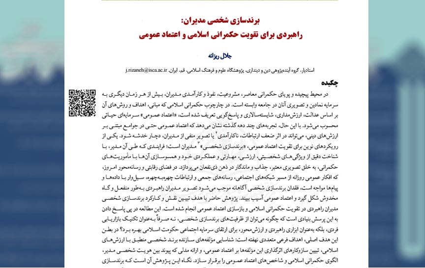 در محیط پیچیده و پویای حکمرانی معاصر، مشروعیت، نفوذ و کارآمدی مدیران، بیش از هر زمان دیگری به سرمایه نمادین و تصویری آنان در جامعه وابسته است. در چارچوب حکمرانی اسلامی که مبانی، اهداف و روشهای آن بر اساس عدالت، ارزشمداری، شایستهسالاری و پاسخگویی تعریف شده است، «اعتماد عمومی» سرمایهای حیاتی محسوب میشود. با این حال، تجربههای چند دهه گذشته نشان میدهد که اعتماد عمومی حتی در جوامع مبتنی بر ارزشهای دینی، میتواند در اثر ضعف ارتباطات، ناکارآمدی[۱] یا تصویر منفی از مدیران، دچار خدشه شود. یکی از رویکردهای نوین برای تقویت اعتماد عمومی، «برندسازی شخصی»[۲] مدیران است؛ فرایندی که طی آن مدیر، با شناخت دقیق از ویژگیهای شخصیتی، ارزشی، مهارتی و عملکردی خود و همسوسازی آنها با مأموریتهای حکمرانی، به خلق تصویری معتبر، جذاب و ماندگار در ذهن ذینفعان میپردازد. در فضای رقابتی و رسانهمحور امروز، که افکار عمومی روزانه از مسیر شبکههای اجتماعی، رسانههای جمعی و ارتباطات چهرهبهچهره، سیلوار با دادهها و پیامها مواجه است، فقدان برندسازی شخصی آگاهانه موجب میشود تصویر مدیران راهبردی بهطور منفعل و گاه مخدوش شکل گیرد و اعتماد عمومی آسیب ببیند. پژوهش حاضر با هدف تبیین نقش و کارکرد برندسازی شخصی مدیران راهبردی در تقویت حکمرانی اسلامی و بازسازی اعتماد عمومی انجام شده است. این مطالعه در پی پاسخ دادن به این پرسش بنیادی است که چگونه میتوان از ظرفیتهای برندسازی شخصی، نه صرفاً بهعنوان تکنیک بازاریابی فردی، بلکه بهعنوان ابزاری راهبردی و ارزشمحور، برای ارتقای سرمایه اجتماعی حکومت اسلامی بهره برد؟ در بطن این هدف اصلی، اهداف فرعی متعددی نهفته است: شناسایی مؤلفههای سازنده برند شخصی منطبق با ارزشهای اسلامی، تبیین سازوکارهای اثرگذاری این مؤلفهها بر اعتماد عمومی، و ارائه مدلی که پیوند بین هویت شخصی مدیر، الگوی حکمرانی اسلامی و شاخصهای اعتماد عمومی را برقرار سازد. نگاه این پژوهش آن است که برندسازی شخصی، اگر بر پایه صداقت، عمل به وعدهها، عدالتورزی و کارآمدی شکل گیرد، نهتنها تعارضی با آموزههای اسلامی ندارد، بلکه میتواند به ابزاری مشروع و کارآمد برای ترویج الگوی مدیر تراز انقلاب اسلامی بدل شود. از نظر روششناسی، تحقیق حاضر از نوع کاربردی با رویکرد کیفی است. دادهها به شیوه اسنادی و میدانی گردآوری شده است. در بخش اسنادی، منابع شامل کتب، مقالات علمی داخلی و خارجی، اسناد بالادستی مرتبط با حکمرانی اسلامی، آموزههای دینی و مطالعات حوزه برندسازی شخصی بررسی و تحلیل شدهاند. در بخش میدانی، مصاحبههای نیمهساختاریافته با نمونهای هدفمند از خبرگان شامل استادان دانشگاه، پژوهشگران حوزه حکمرانی، مدیران با تجربه در سطوح کلان و کارگزاران رسانه انجام شده است تا ابعاد و الزامات بومیشده برندسازی شخصی مدیران در بستر ایران اسلامی استخراج شود. دادههای گردآوریشده با روش تحلیل مضمون کدگذاری، دستهبندی و تفسیر گردید. همچنین، برای اطمینان از روایی یافتهها، از راهبرد بازبینی توسط مشارکتکنندگان و مقایسه با متون معتبر استفاده شد. یافتههای تحقیق نشان میدهد که برندسازی شخصی در حکمرانی اسلامی دارای چهار بعد اساسی است: بعد شخصیتی و اخلاقی، که بر صداقت، تعهد، تواضع، شجاعت، عدالتورزی و خدمتگزاری به مردم استوار است؛ بعد مهارتی و تخصصی، که به شایستگیهای علمی، مدیریتی و راهبردی مدیر میپردازد و شرط لازم برای ایجاد اعتبار حرفهای است؛ بعد ارتباطی و تعاملی، که شامل توانایی برقراری ارتباط مؤثر با مردم، گوش دادن فعال، شفافیت در اطلاعرسانی، پاسخگویی و اقناع مخاطب میشود؛ و بعد نمادین و فرهنگی، که به نقش مدیر بهعنوان الگو و مرجع فرهنگی در جامعه اسلامی اشاره دارد و از طریق رفتار، گفتار و سبک زندگی او منتقل میشود. همافزایی این ابعاد، برند شخصیای را شکل میدهد که نه یک تصویر مصنوعی و تبلیغاتی، بلکه بازتاب عینیِ شخصیت و عملکرد واقعی مدیر در ذهن جامعه است. 